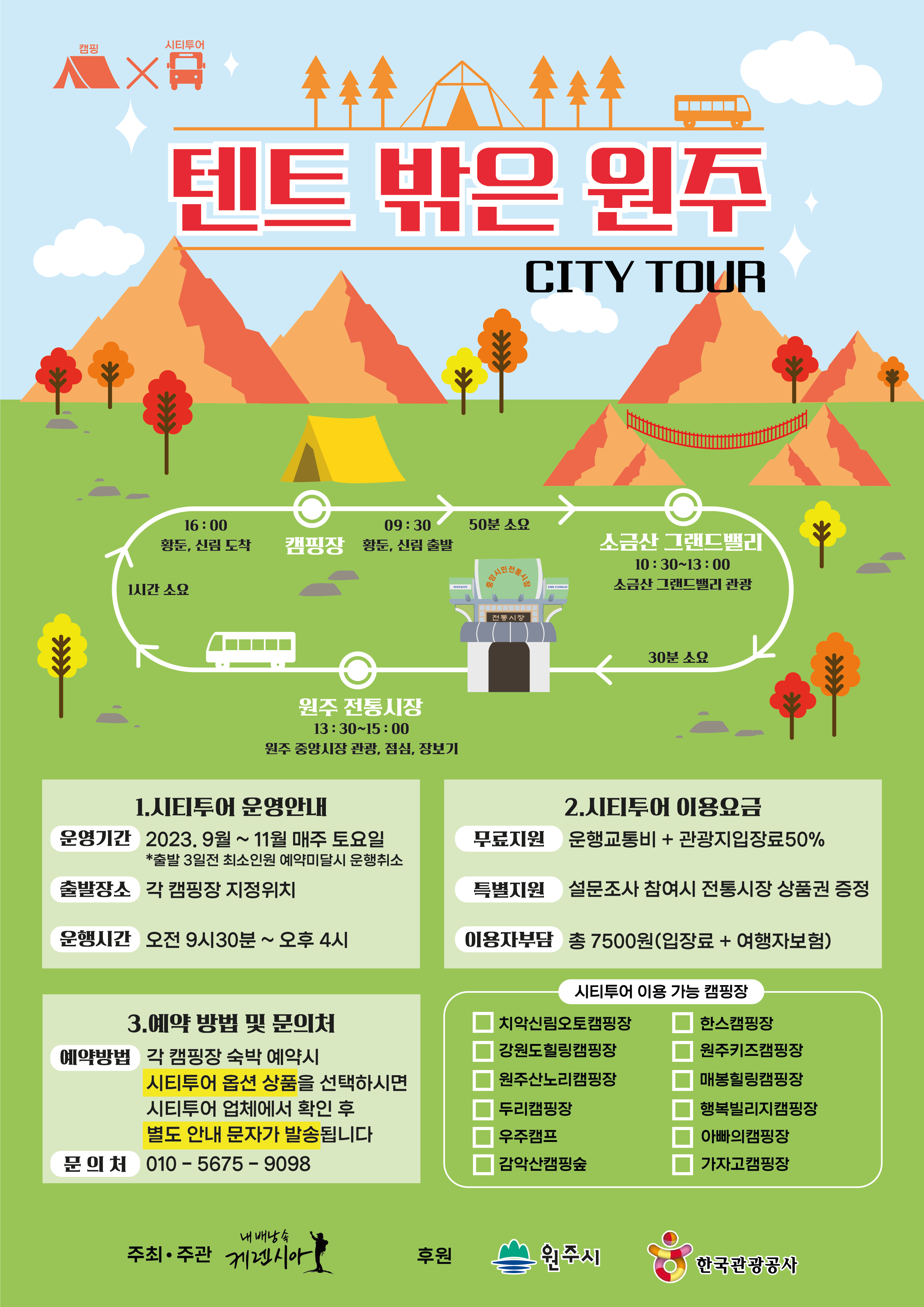 ![]() 2023년 콘텐츠형 시티투어버스 - 원주시 야영장 캠퍼 여행 [텐트 밖은 원주 시티투어] 안내 원주시 신림면 지역 캠핑장에서 시티투어버스를 타고 출발하여 원주 관광지(소금산 그랜드 밸리, 전통시장)를 편하게 관광하고 다시 캠핑장으로 돌아오는 코스입니다! ▷기간 : 23년 9월~11월 매주 토요일 ▷시티투어 1인 이용 요금 : 7,500원 (관광지 입장료 및 여행자보험 가입), 버스비 무료 ▷출발 : 토요일 오전 9시 25분 (지정된 정류장) ▷도착 : 오후 4시 30분경 (지정된 정류장) ▷설문조사 참여시 전통시장에서 사용 가능한 상품권 제공 ** 시티투어 예약은 선착순으로 진행되며 캠핑장 이용객에 한하여 이용 가능합니다. ** 시티투어 예약/문의 010-5675-9098 (월~금 09-18시)